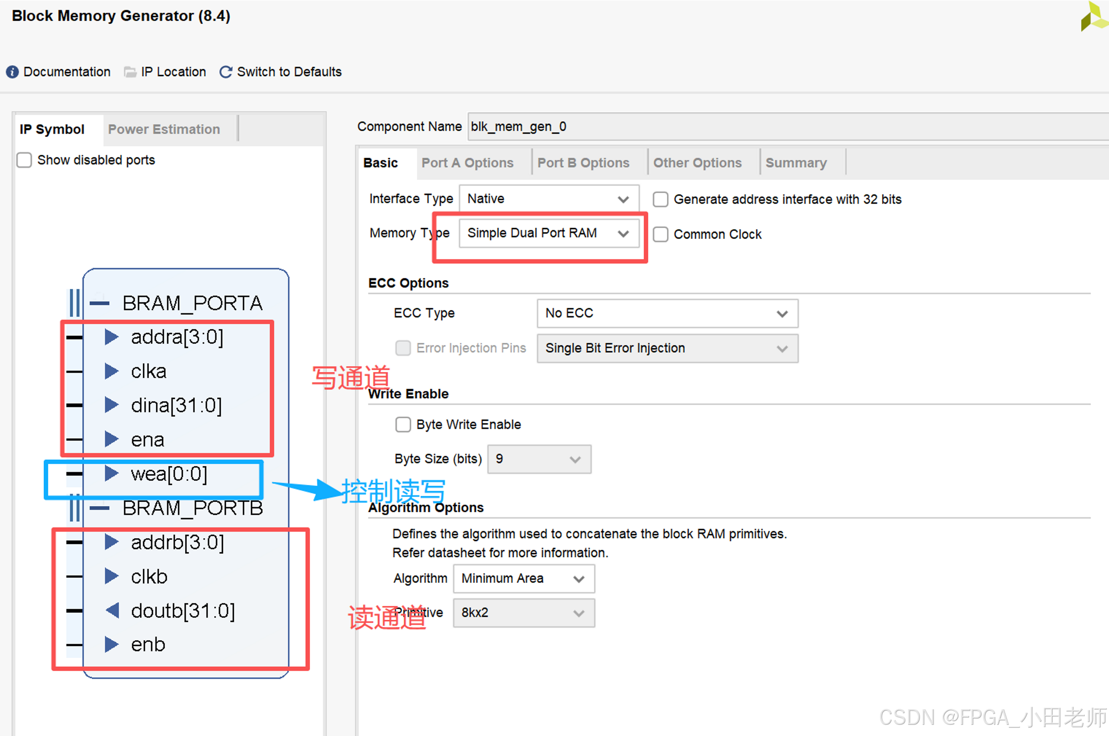 角色固定:Simple Dual Port RAM的A口写、B口读,结构清晰,非常适合单向数据流缓冲。