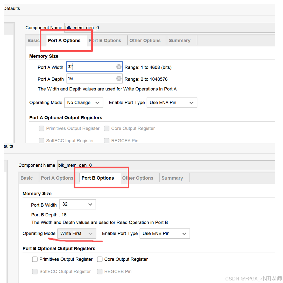 在Simple Dual Port RAM下对应的配置选项有两页,一个是Port A一个是Port B,Port A的Mode可以选择No change / Write First / Read First 而 Port B只能设定Write First模式,即到达Port B的数据就是直接可以输出的。