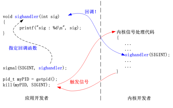 - signal() 将函数回调函数传递给内核,使得内核可以在恰当的时机回调 sighandler。