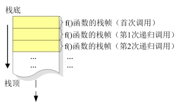 - 递归调用时,函数的栈内存的变化如下图所示。可见,随着递归函数的层层深入,栈空间逐渐往下增长,如果递归的层次太深,很容易把栈内存耗光。