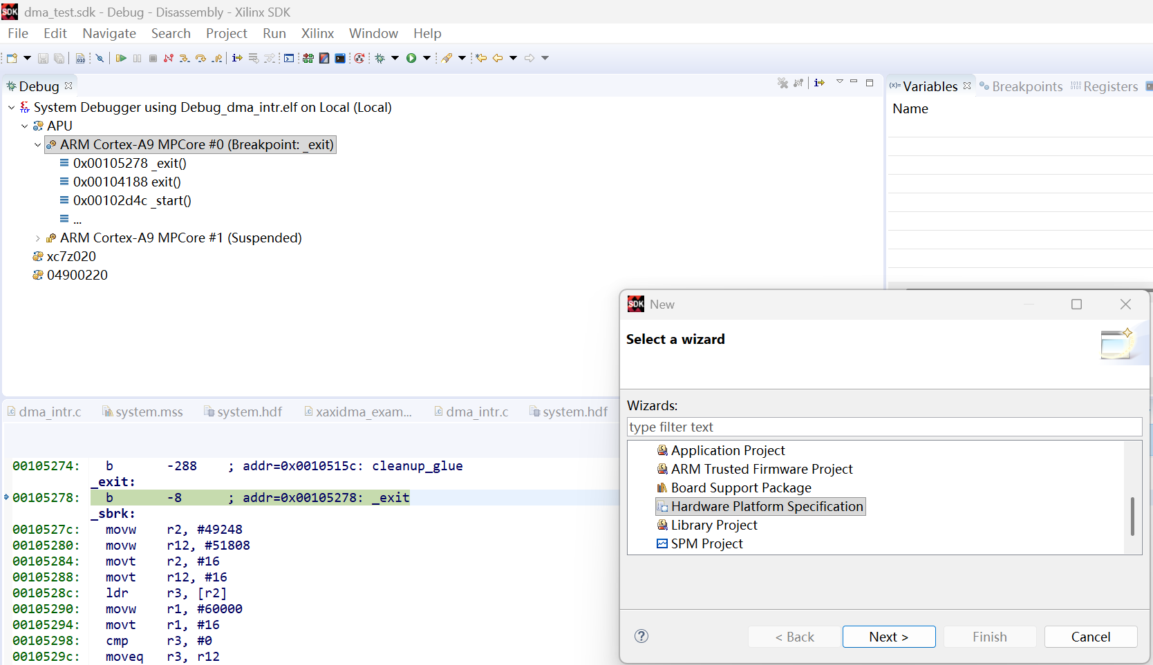 3、通过launch SDK打开工程,会发现有两个platform平台,以及一些c语言工程。这里解释一下,这两个平台都是例程自己的,我们不要这两个。直接file-new-other,在xilinx里面找到Hardware Platform选项。