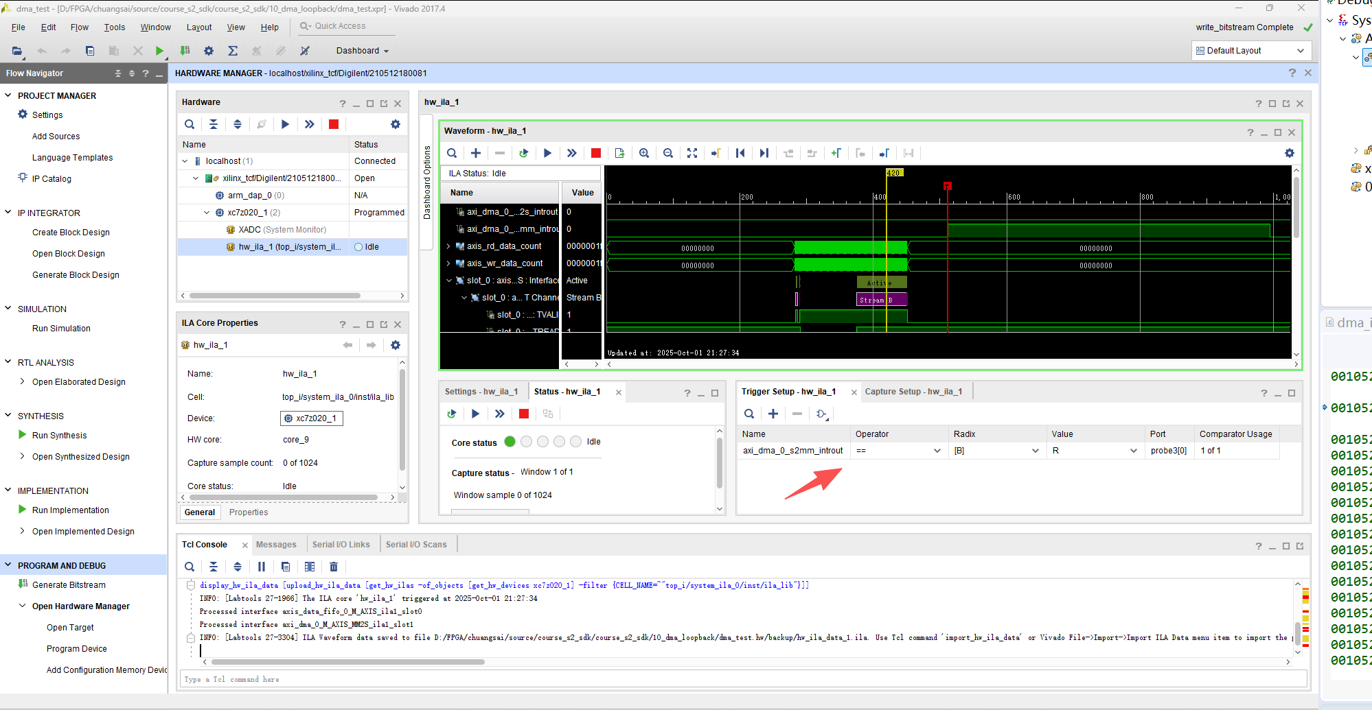 7、回去vivado,open target里面的自动连接。然后就会弹出ila的图像,点击波形上方那个三角形,然后回到SDK,点击resume(Source正下面),然后再回去看波形,就会发现有了,这里要解释一下