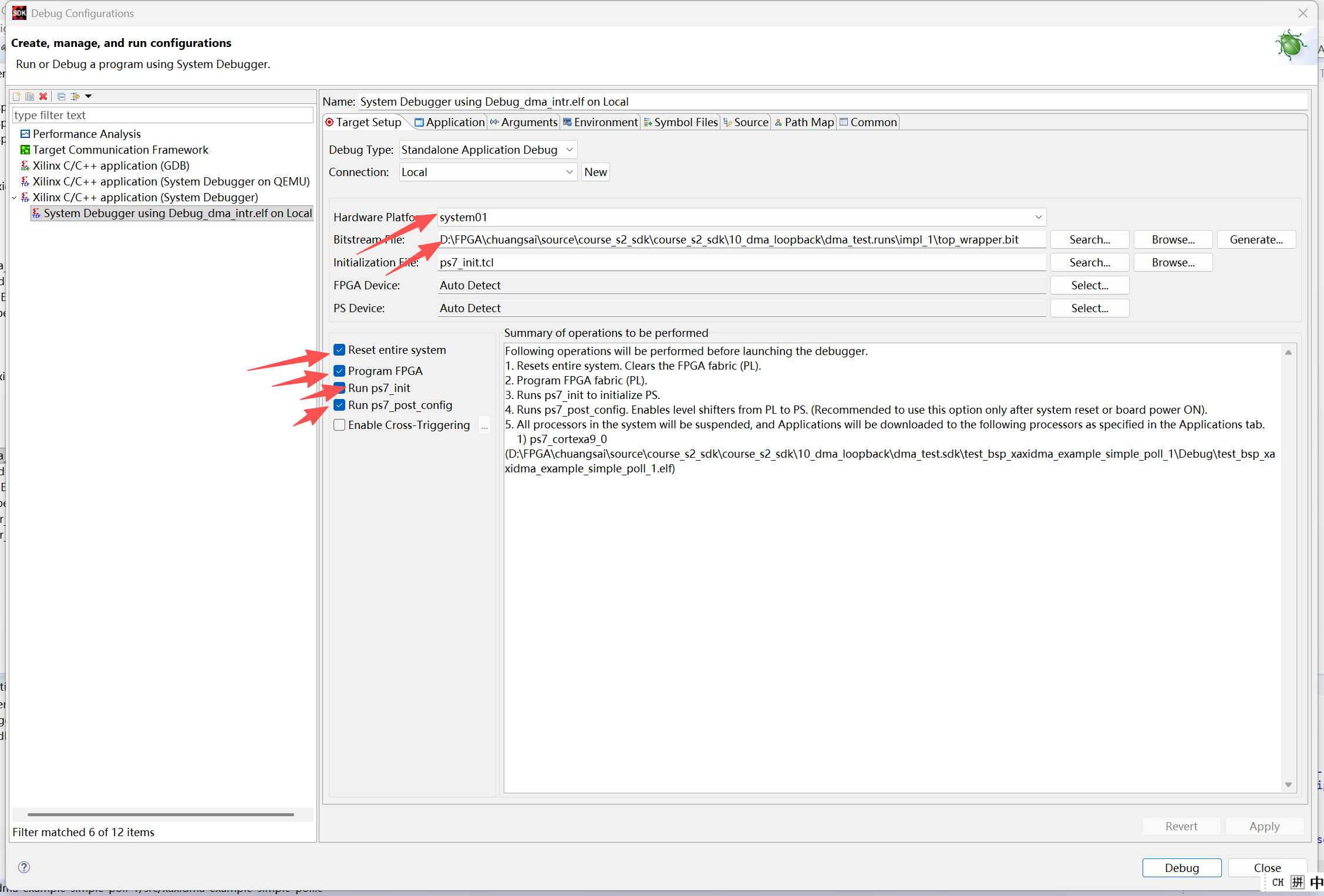 6、运行就不展示了,展示如何调试。可以去vivado的block design里面看到是有ila的,于是直接SDK-run-Debug configuration,这里需要修改的有: