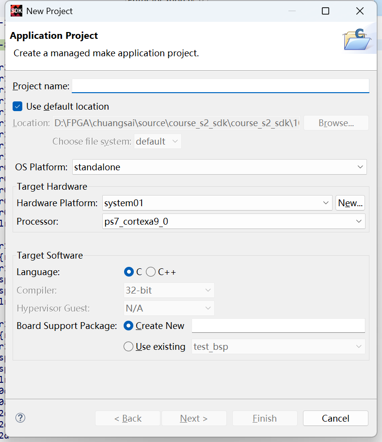 4、接下来就是导入c工程,直接file-new-application project里面选中那个fsbl的。