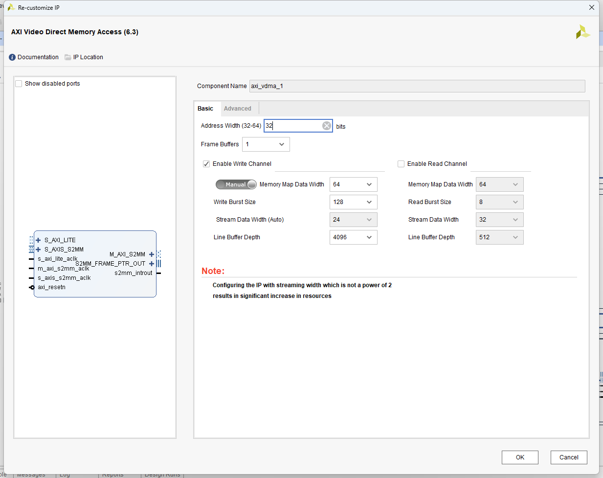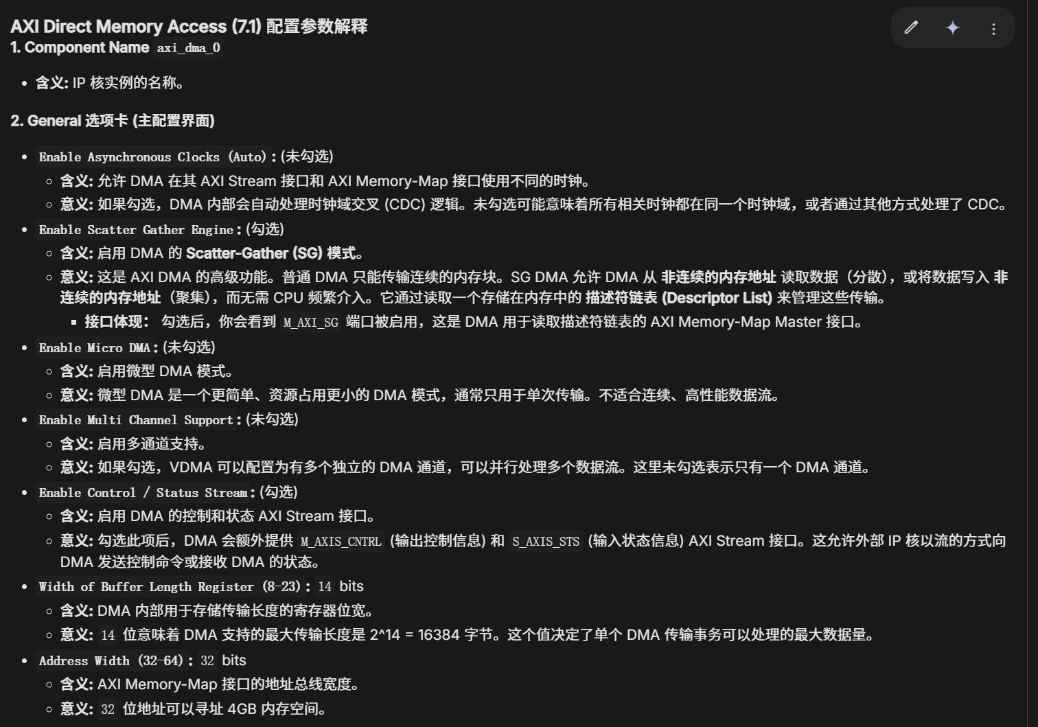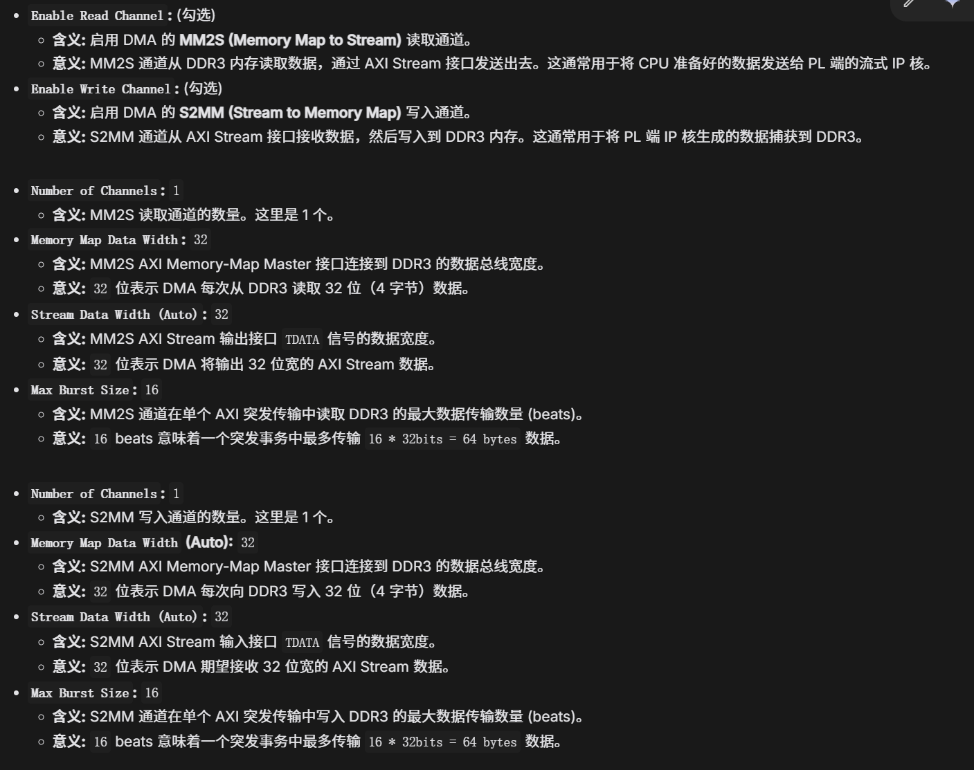 这个模块简称AXI VDMA,是专门为视频流传输开辟的模块,从DMA演变过来的,要介绍这个得先讲讲AXI DMA模块,AXI DMA也有转协议的功能,对于视频流来说肯定要满足AXI Stream协议的,但是我们ps通信是用AXI4与AXI3进行通信,所以无法直接接收视频流数据存进DDR3,所以需要这个模块连接在他们中间进行协议转换,具体转换逻辑是视频流数据输入然后进入fifo,达到一定长度后以axi4协议突发传输出去(包含突发长度),因为fifo缓冲区能存储视频流数据(只要一直发一直发到溢出),一般不会出现这种情况的,因为有消隐时间,不会说真的无穷无尽发送数据。