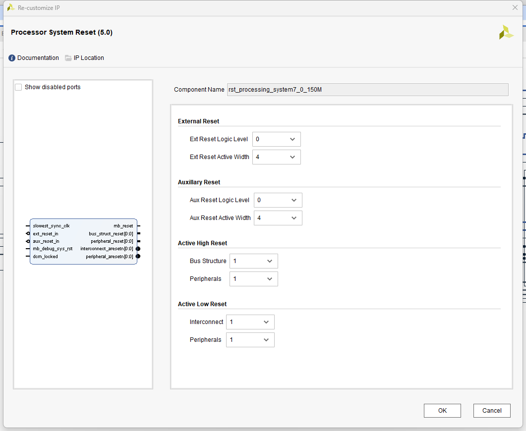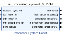 这是他的接口信号以及内部配置。这个只需要注意一下in就是输入,out输出,以及resetn就是低电平有效,reset是高电平有效即可,我感觉没什么需要赘述的,甚至你可以直接用一个输出复位来控制全部(除了一些EMIO口上的复位信号)。这里分了很多个复位可能是为了大项目方便控制吧,在当前项目无特殊作用。