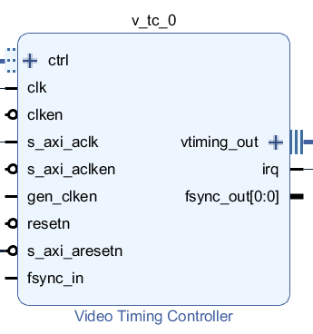 ctrl是外界输入的接口(axi4),vtc作为从机,fsync_in应该是有关帧同步的信号,这里不需要连接他不做解释,vtiming_out接口是hdmi显示的控制接口,内部有行场同步信号和视频有效信号以及消隐信号(就是无效时间就拉高,暂时可以这样理解)。