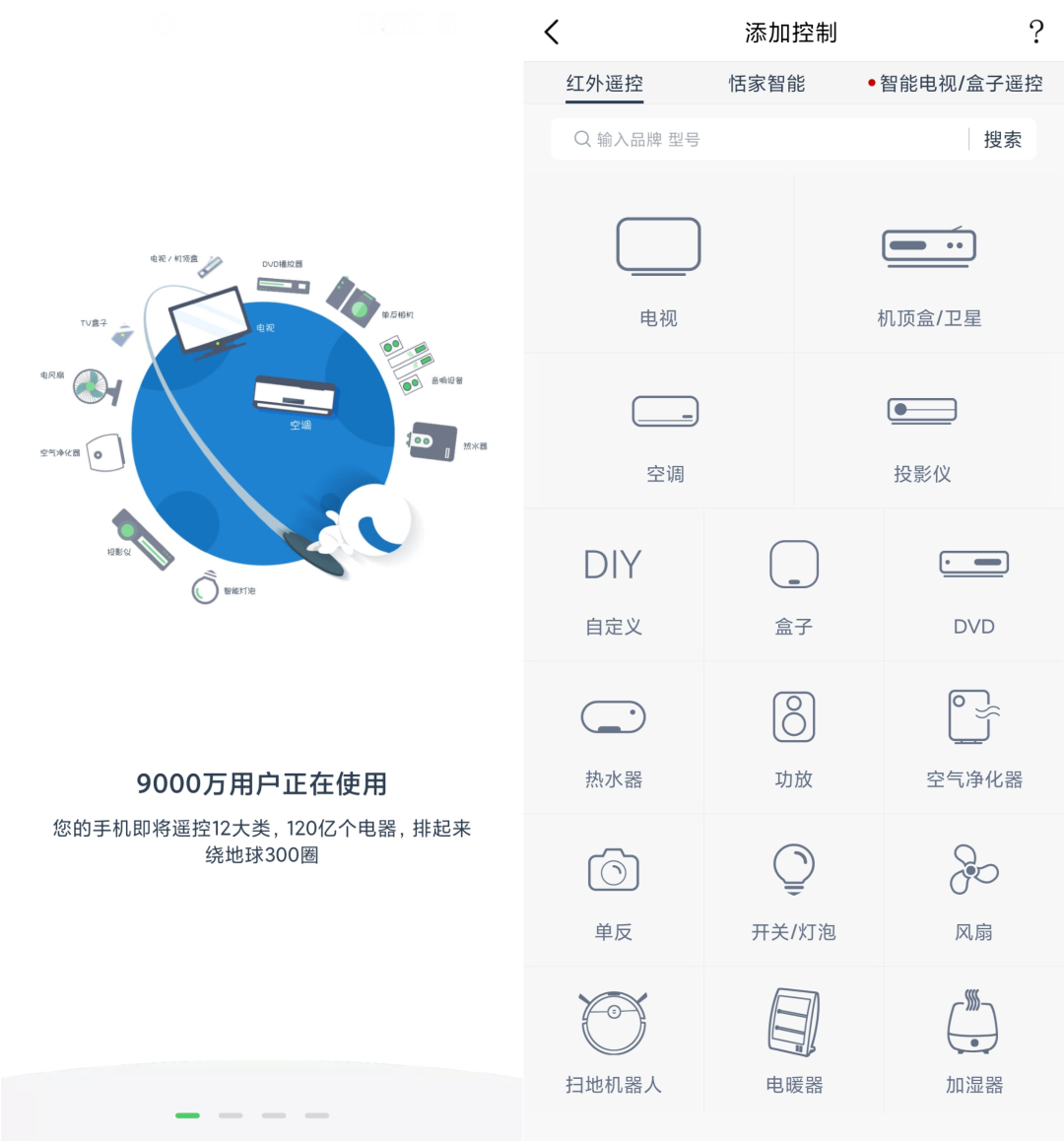 遥控精灵的核心功能是将手机变成万能遥控器,前提是你的手机具备红外发射功能。官方宣称其码库支持全球超过7000种电器,覆盖电视、机顶盒、空调、投影仪、功放、风扇甚至智能灯泡等众多设备。