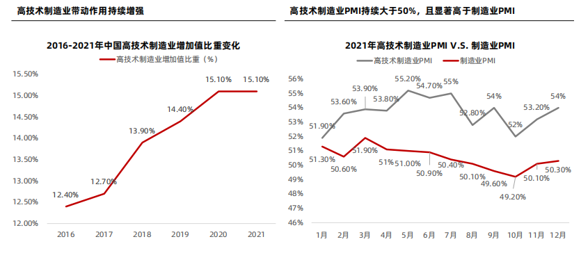 2021年,高技术制造业增加值比上年增长18.2%,高于规模以上工业平均水平8.6个百分点;2021年一整年,我国高技术制造业PMI均大于50%,且明显高于制造业PMI,表明高技术制造业处于高速扩张阶段,态势良好。