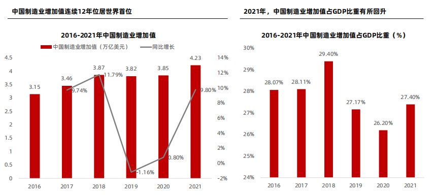 2021年,我国制造业增加值为4.23万亿美元,合人民币31.4万亿元,同比增长9.8%,表明我国制造业总体发展平稳。中国制造业增加值连续12年位居世界首位。