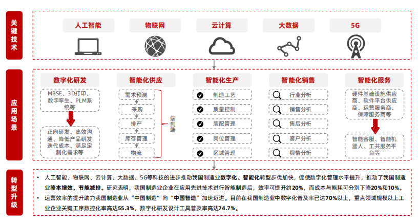 人工智能、物联网、云计算、大数据、5G等先进技术的应用不断拓宽,遍布制造业中的研发、供应、生产、销售、服务等应用场景,促使数字化管理水平提升,更多的是提升了运营效率,从而推动我国制造业转型升级。