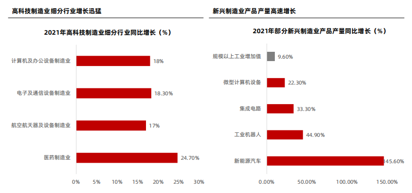 从细分产品来看,许多新兴制造业产品产量增势强劲,尤其是微型计算机设备、集成电路、工业机器人与新能源汽车,其中,新能源汽车在2021年产量同比增长高达145.6%,表明新兴产品在制造业的比重越来越大。