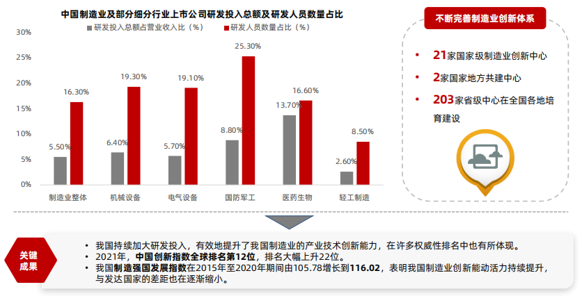 近年来,我国制造业的研发投入不断加大,制造业研发投入总额及研发人员数量逐年上升,尤其是在机械设备、国防军工、医药生物等领域;我国也不断完善制造业创新体系,建立了200余个国家级、地方级创新中心,推动制造业的大力发展,因此,我国的创新能动活力快速提升。