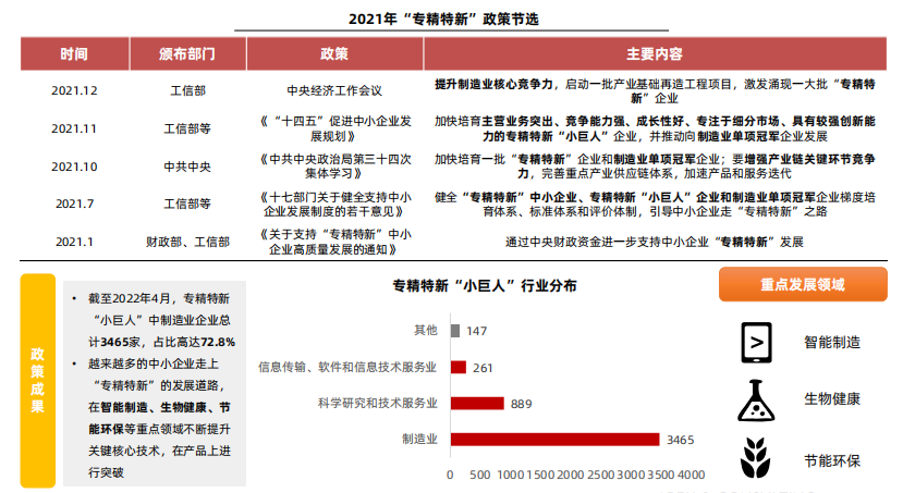 中小企业在我国产业链中一直占据着重要地位。近年来,国家及各地政府纷纷针对制造业中小企业出台相关政策,鼓励中小企业走"专精特新"的发展道路,推动我国制造业转型升级。