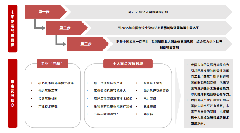 我国未来将持续推动制造强国的建设,朝着世界制造强国的前列迈进。未来制造业强国和制造业高质量发展的建设核心将以工业“四基”为基础,将新一代信息技术产业等十大领域作为重点推进产业,助力制造业转型升级。