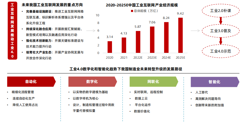 我国未来将继续推动工业互联网的快速发展,加快完善产业生态布局,带动制造业转型升级,朝自动化、数字化、网联化、智能化发展。