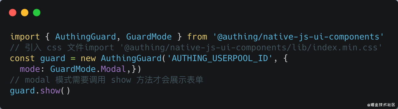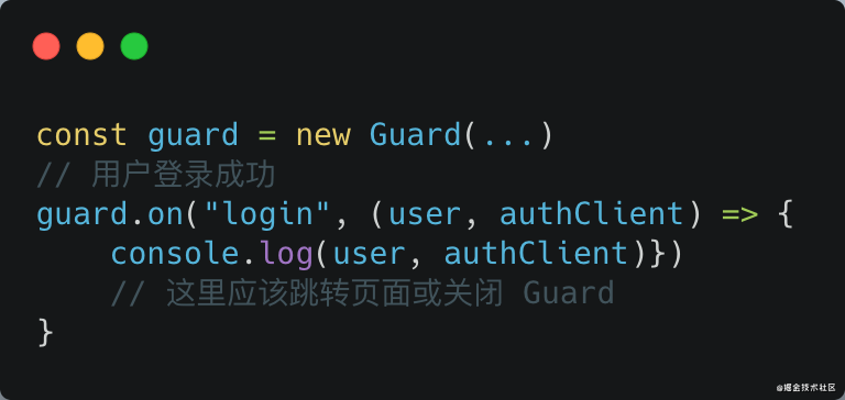 需要注意的是,在原生 JavaScript 版本中,如果是模态框模式,需要手动调用 gaurd.show(),Guard 才会展示,其他框架的组件则可以通过传入 visible 参数控制显示和隐藏。