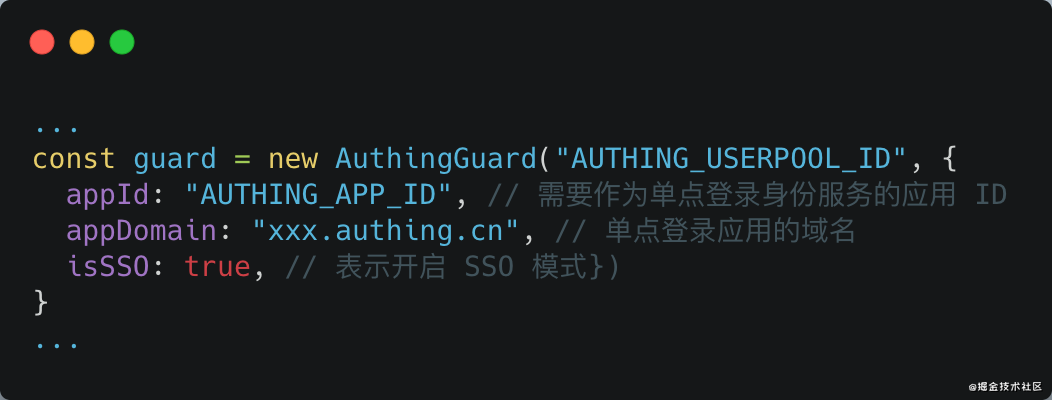 随着企业发展,你的公司可能会采购各种 SaaS 软件、OA 系统、ERP 系统等,虽然这些软件提高了办公效率,但每个系统都需要单独登录就会显得非常繁杂,所以 SSO 在企业中使用频率会非常高,本次 Guard2.0 全面支持了 SSO,你需要做的只是在 Authing 中注册一个应用,然后将应用 ID 和 域名,及 isSSO: true 传入 Guard 来开启 SSO 登录模式: