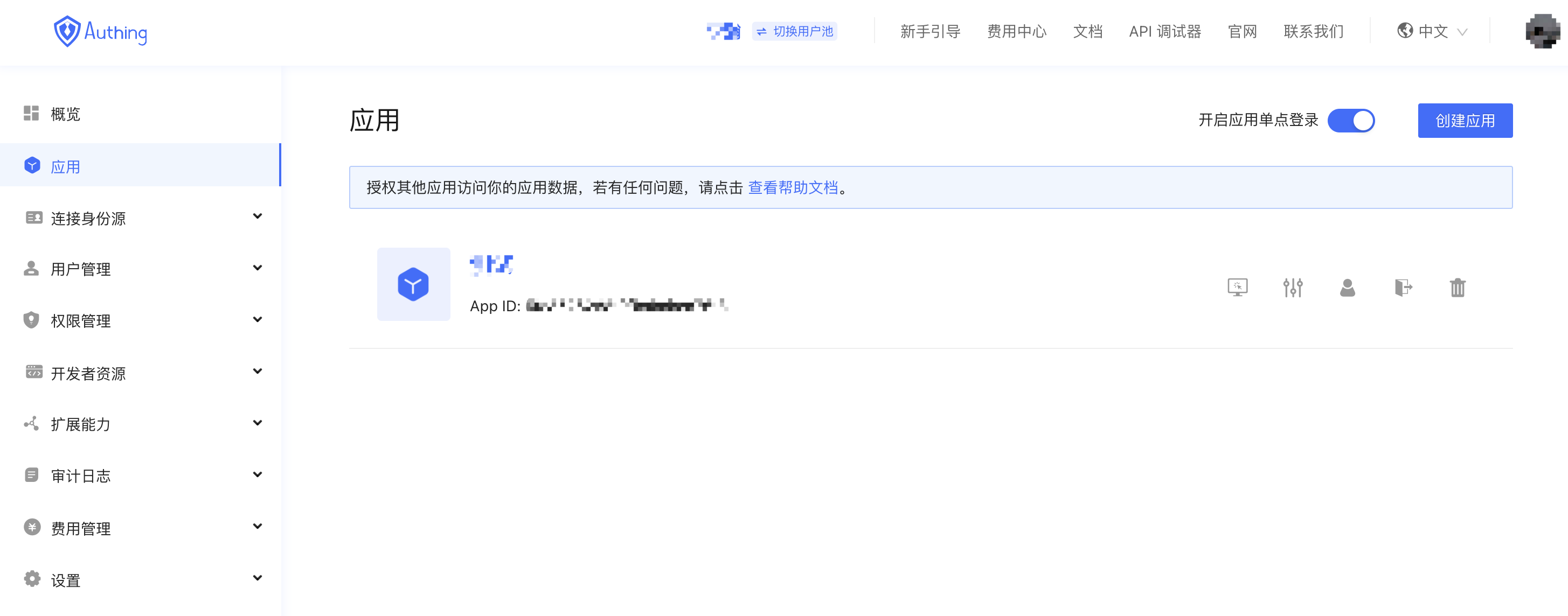 首先要在 Authing 注册一个账号,然后进入控制台,点击左侧的应用菜单项,在右侧会看到一个默认创建好的应用。