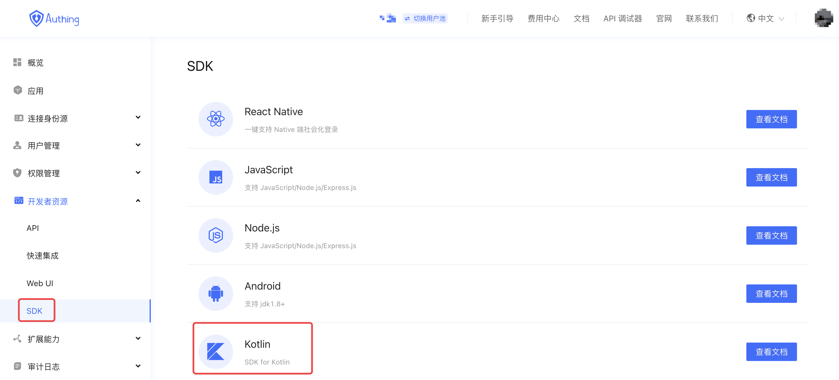 点击左侧的SDK菜单项,在右侧会看到有 Kotlin 的 SDK ,点击查看文档即可查看详细的 API。