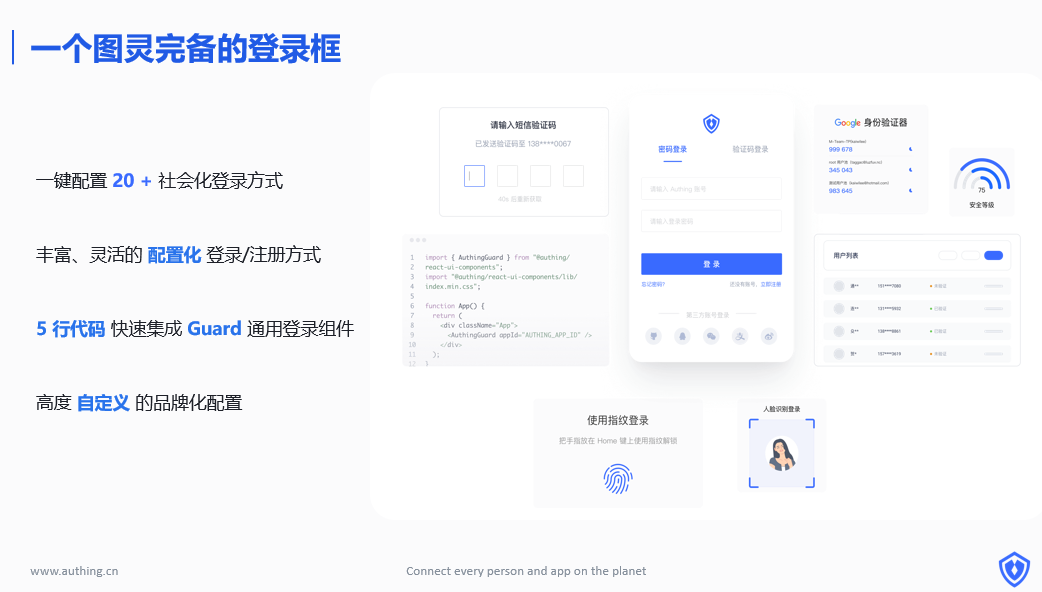 Authing 提供所有主流编程语言的 SDK,开放 1000+ API,在 API 之上,我们提出了全新开发理念——Hyper Component。Authing 将登录框做成组件的形式,只需要 5 行代码即可快速集成 Guard 通用登录组件,一键配置 20+ 社会化登录方式。只需几秒,即可完成身份系统搭建。另外,我们还提供了跨平台的组件化方案,支持 Web、iOS 和安卓端等多端无缝登录体验。