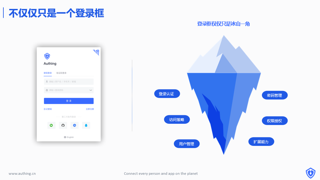 Authing 提供的SDK和API帮助企业快速搭建用户身份管理系统,包括多样的登录方式、个性化登录页面、设备控制、用户行为分析、安全认证、单点登录和实时信息同步等功能。此外,其HyperComponent理念简化了登录组件集成,5行代码即可实现。Authing还提供永久免费版,支持高达8,000MAU,助力开发者专注于核心业务开发。