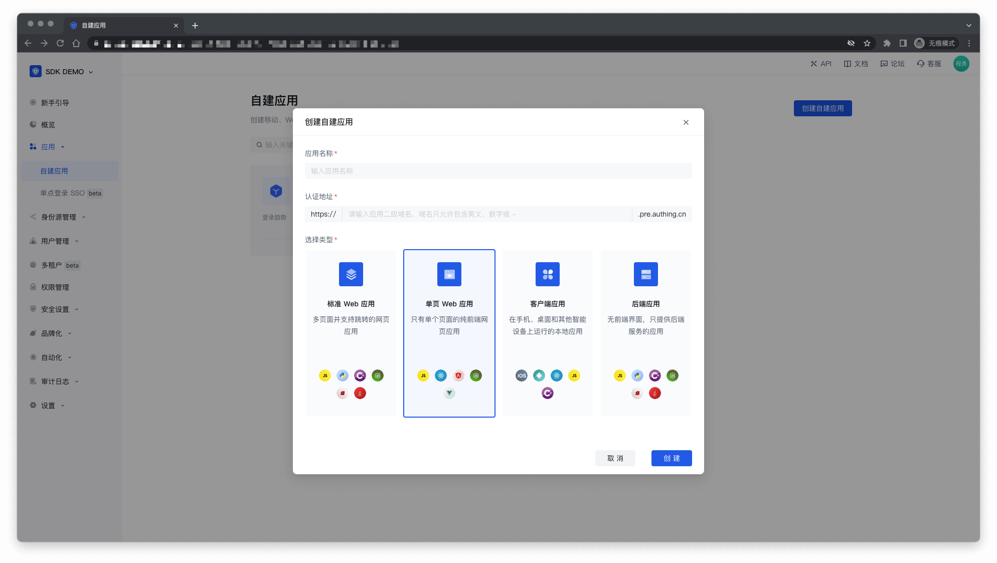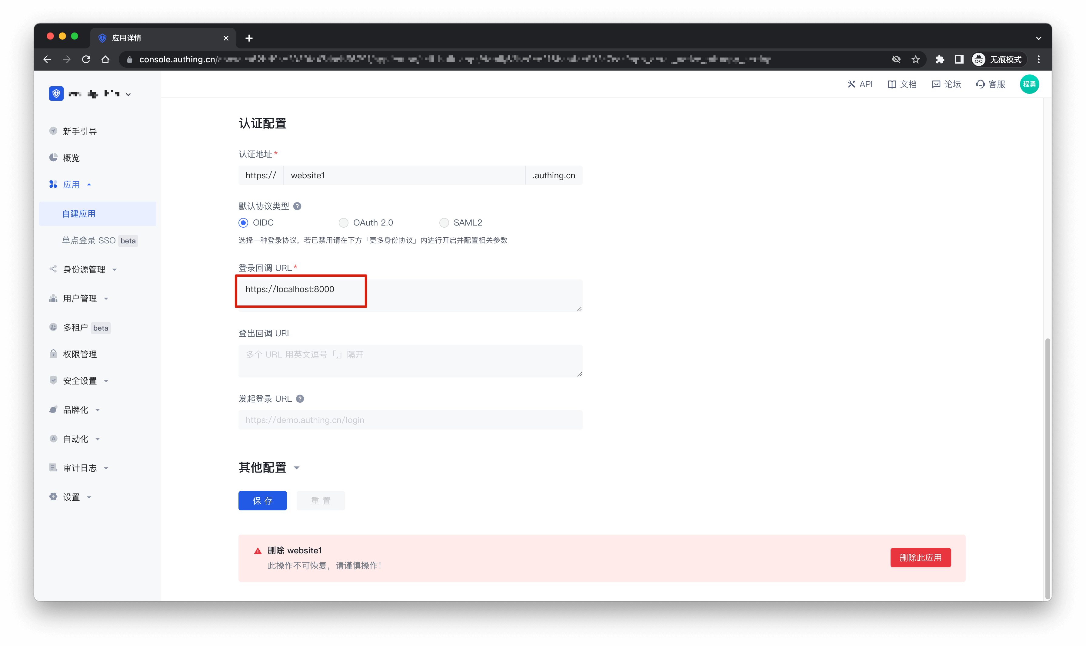认证地址:选择一个二级域名,必须为合法的域名格式,例如 my-spa-app;