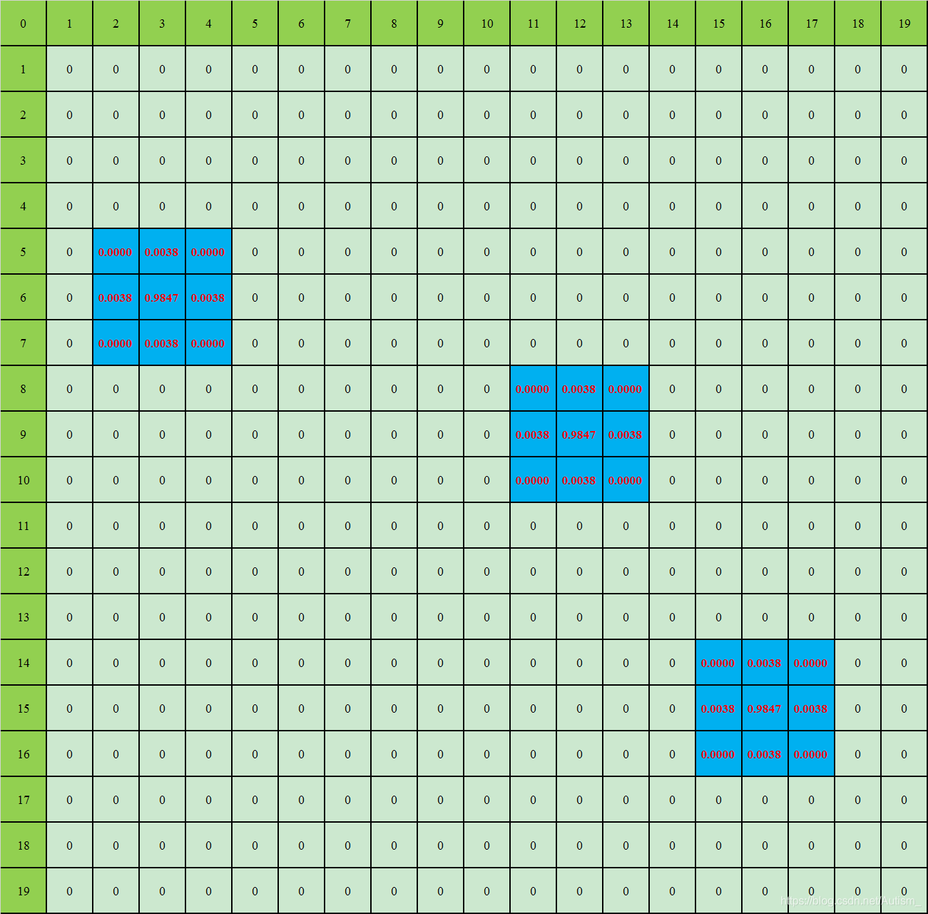 1. 人群图像标注表示: 如图1所示19*19大小方格表示人群图像(绿色外层方格表示坐标),该图像包含3个人,以左上角为坐标原点,坐标(3,6), (12,9), (17,15)表示标注的人头中心点位置(在图中表示方格对应坐标的值为1)