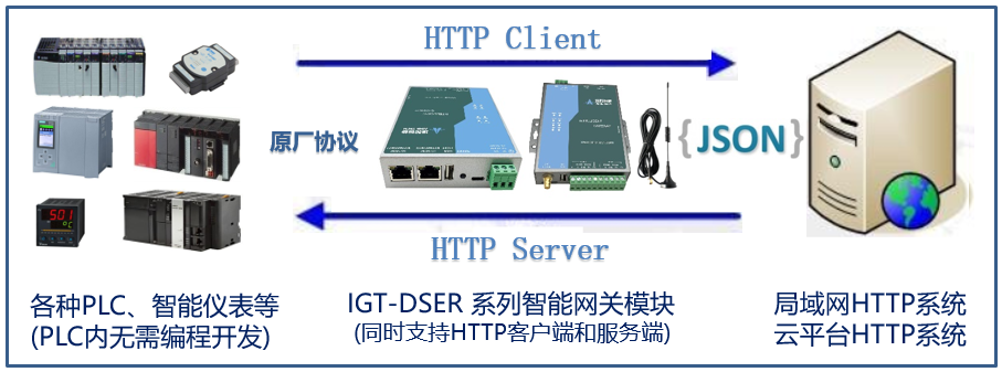 不用联外网不用写程序,通过智能网关IGT-DSER简单配置参数,即可实现HTTP协议对接各种系统平台,支持POST/GET/PUT等多种方法,可同时作为HTTP协议的客户端和服务端。