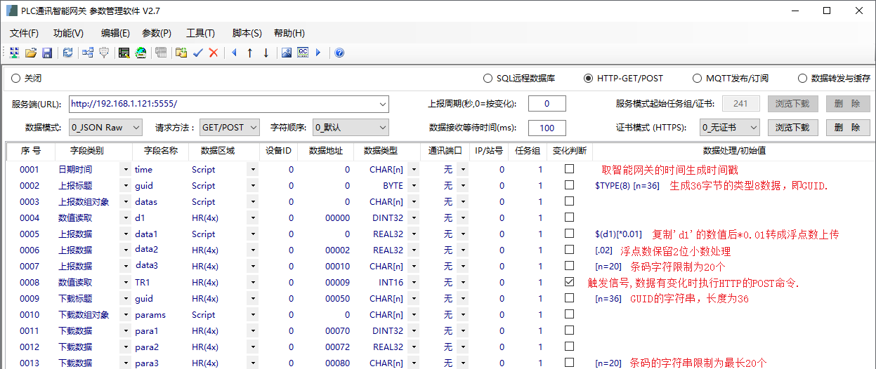 上图中HR0是32位整数,对应400001;HR2是浮点数,对应400003;HR20是长度为20的字符串,对应400021开始的10个寄存器。MODBUS地址和数据模型。HR9即400010是触发信号,数值有变化时智能网关就会将同组('任务组'数值相同)数据自动打包成JSON文件后发送到HTTP服务端,HTTP服务端返回数据后根据所配置的字段进行解析,写入到对应的寄存器。