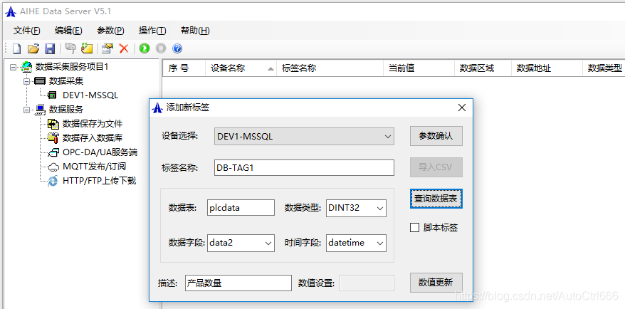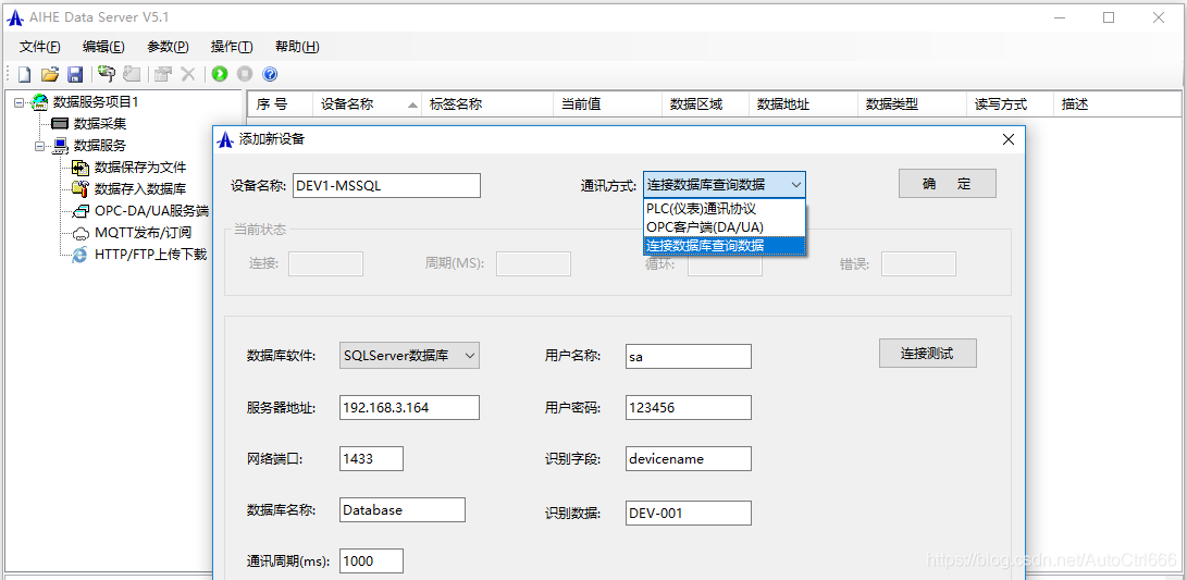 启动AiheDataServer数据服务软件,通过‘文件’->‘新建项目’菜单建立一个新的项目,再通过‘编辑’->‘添加设备’按钮,设置数据库的相关参数,如下图:软件及相关资料下载 OPC的数据存入数据库