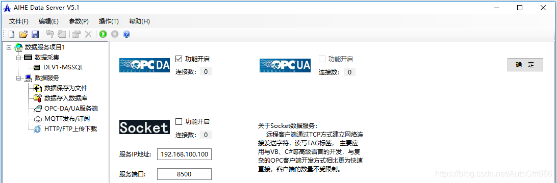 可以看到在主界面上已经增加了一行数据。再通过左边的目录树里面‘数据服务’目录下的‘OPC-DA/UA服务端’节点,勾选开启OPC服务功能,并点击‘确认’按钮保存参数,如下图: