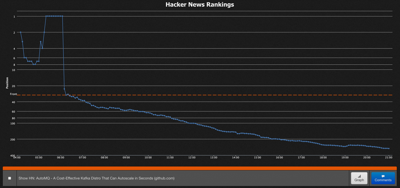 ꔷ AutoMQ: An open source Kafka solution that is more scalable,cost-effective[6]:初看起来,这篇文章似乎与我们登顶的标题非常相近,但是最终呈现出来的结果却截然不同。我们将在后文揭示其中的秘密。作为首篇文章,其内容的主要价值在于试水 HN 的规则,以了解该平台的发帖逻辑。