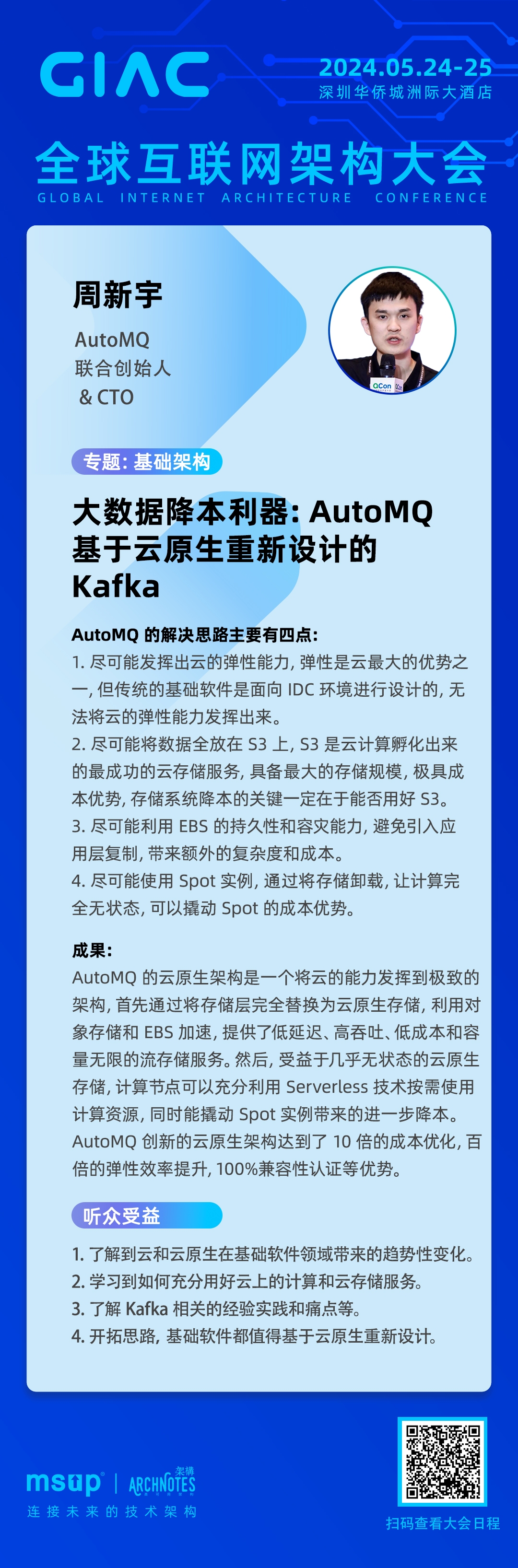 在本次大会的「基础架构」专题中,AutoMQ 联合创始人 & CTO 周新宇受邀参加本次大会,将与大家分享《大数据降本利器:AutoMQ 基于云原生重新设计的 Kafka》的主题演讲。