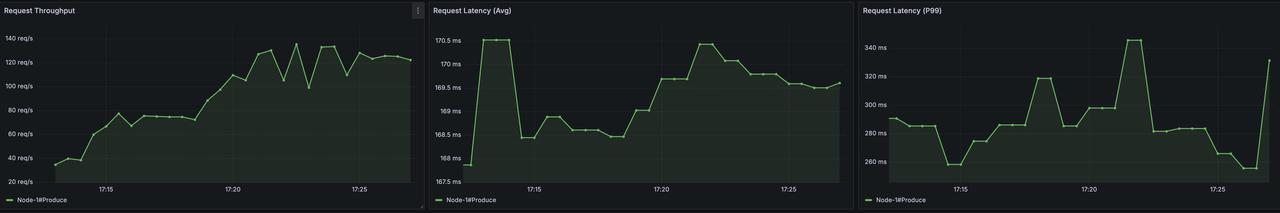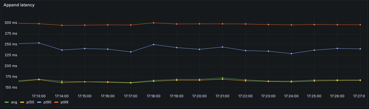 AutoMQ 在实现 S3WAL 对其性能上做了很多优化,尤其是其延迟表现。在我们的测试场景中,S3 WAL Append 的平均延迟为 168ms,P99 296ms。