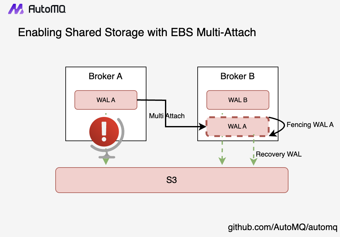 一种常见的误解在于将这种构建于 EBS 上的 Shared WAL 与 Kafka 的分层存储弄混。其实主要区别他们的方式很简单,即判断计算节点 Broker 是否为彻底的无状态。对于 Confluent、Aiven 实现的分层存储来说,他们的 Broker 仍然是有状态的。Kafka 的分层存储要求其分区的最后一个日志段必须在本地磁盘上,因此他们在本地存储上的数据是强耦合计算层的 Broker 的,而 AutoMQ 实现的 EBS WAL 则没有这种限制。当 Broker 节点崩溃后,其他健康的 Broker 节点可以通过 Multi Attach 的方式在毫秒时间内接管 EBS 卷,将其上固定大小(通常是 500MB)的少量 WAL 数据写入到 S3 然后删除卷既可。