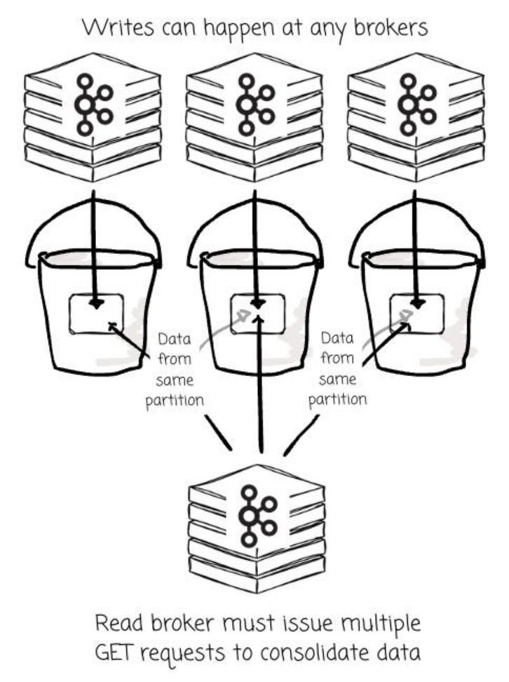 当任意 Broker 随时都能向同一分区写入数据时,该分区的数据就会被打散,以碎片化的形式分布在 S3 的大量小对象中,而这些对象又是由不同的 Broker 各自生成的。