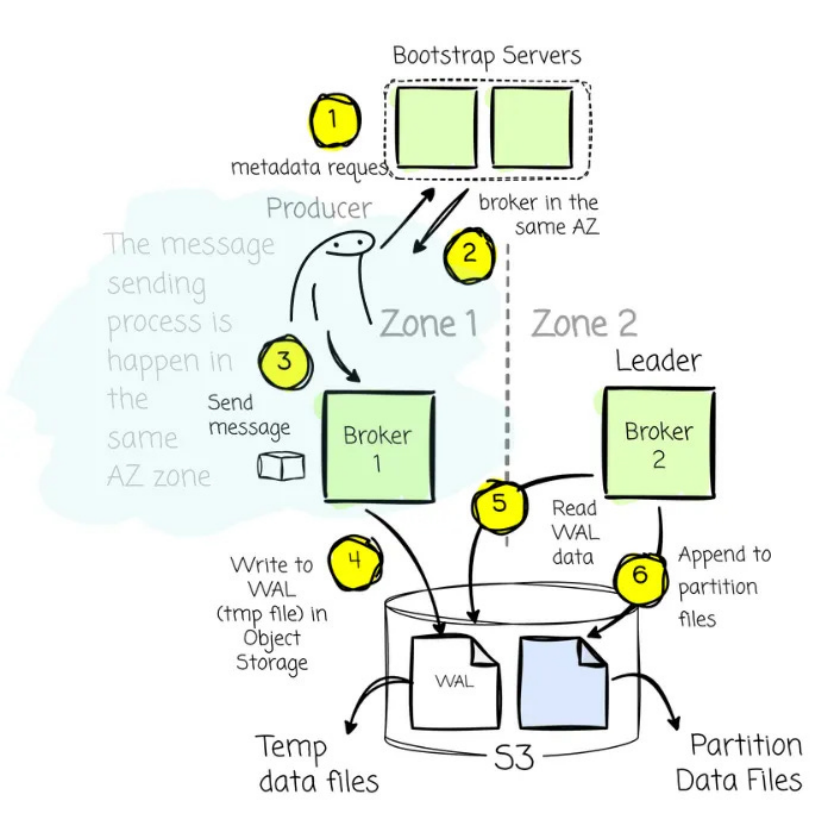 该同区 Broker 会先将接收到的消息写入对象存储的临时文件中。随后,Leader 会“认领”这些临时文件,并将数据正式写入实际的分区位置。之所以采取这种机制,是因为在基于 Leader 的架构中,所有针对分区的最终写入操作,必须由 Leader 亲自经手。