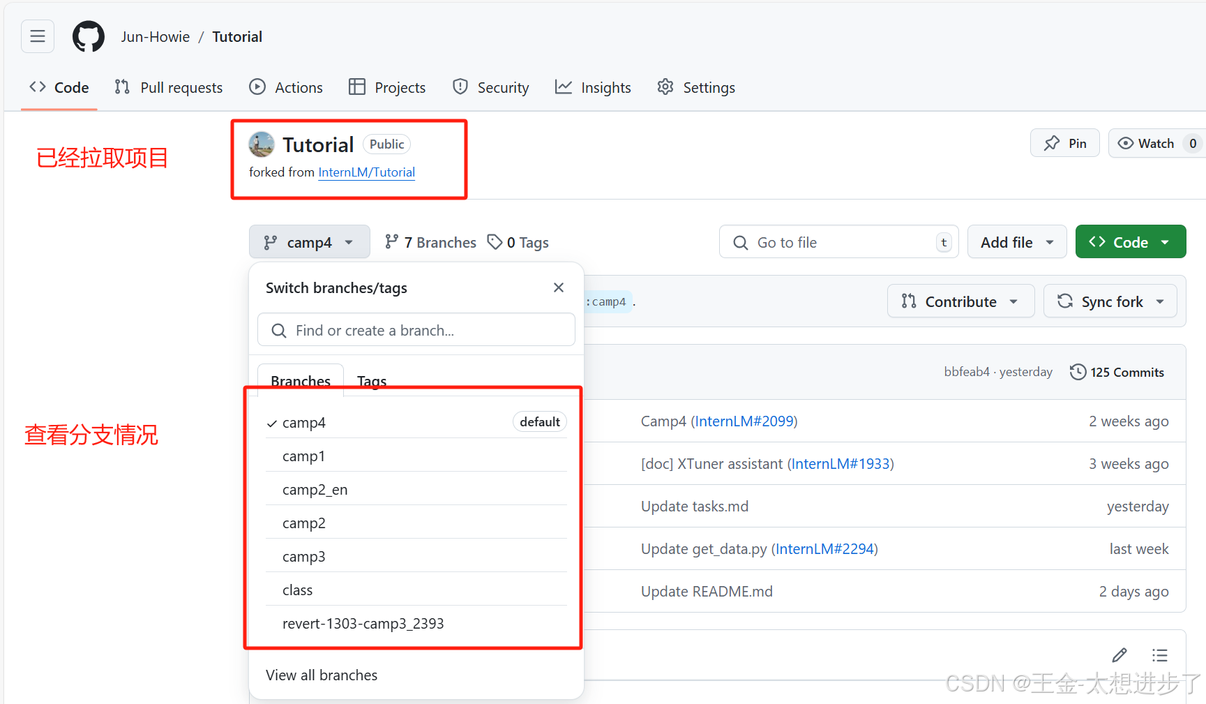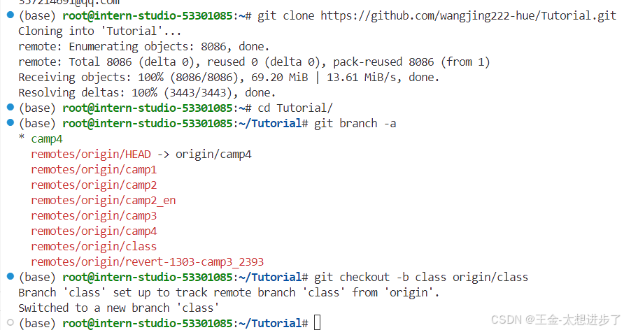 # 修改为自己fork的仓库,改为上图中你的https仓库的git地址,将random-zhou改为自己的用户名 git clone https://github.com/random-zhou/Tutorial.git #git clone git@github.com:random-zhou/Tutorial.git #git clone https://github.com/InternLM/Tutorial.git cd Tutorial/#进去Tutorial git branch -a#查看所有的本地分支和远程分支 git checkout -b class origin/class #基于远程分支 origin/class创建并切换到本地新分支 class
