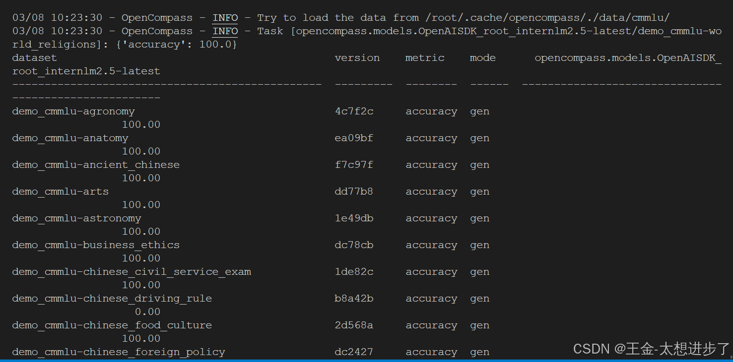 完成配置后, 在终端中运行: python run.py --models puyu_api.py --datasets demo_cmmlu_chat_gen.py --debug. 预计运行10分钟后, 得到结果: