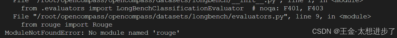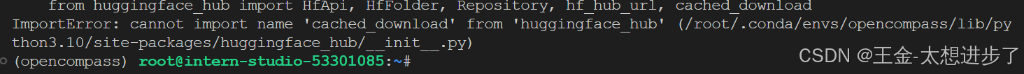 注意:我做的时候有可能是版本升级了会有huggingface-hub和transformers版本不匹配的问题,可能是因为opencompass更新的原因,pip install update huggingface-hub就可以解决;之后还会出现缺少包的情况,比如: