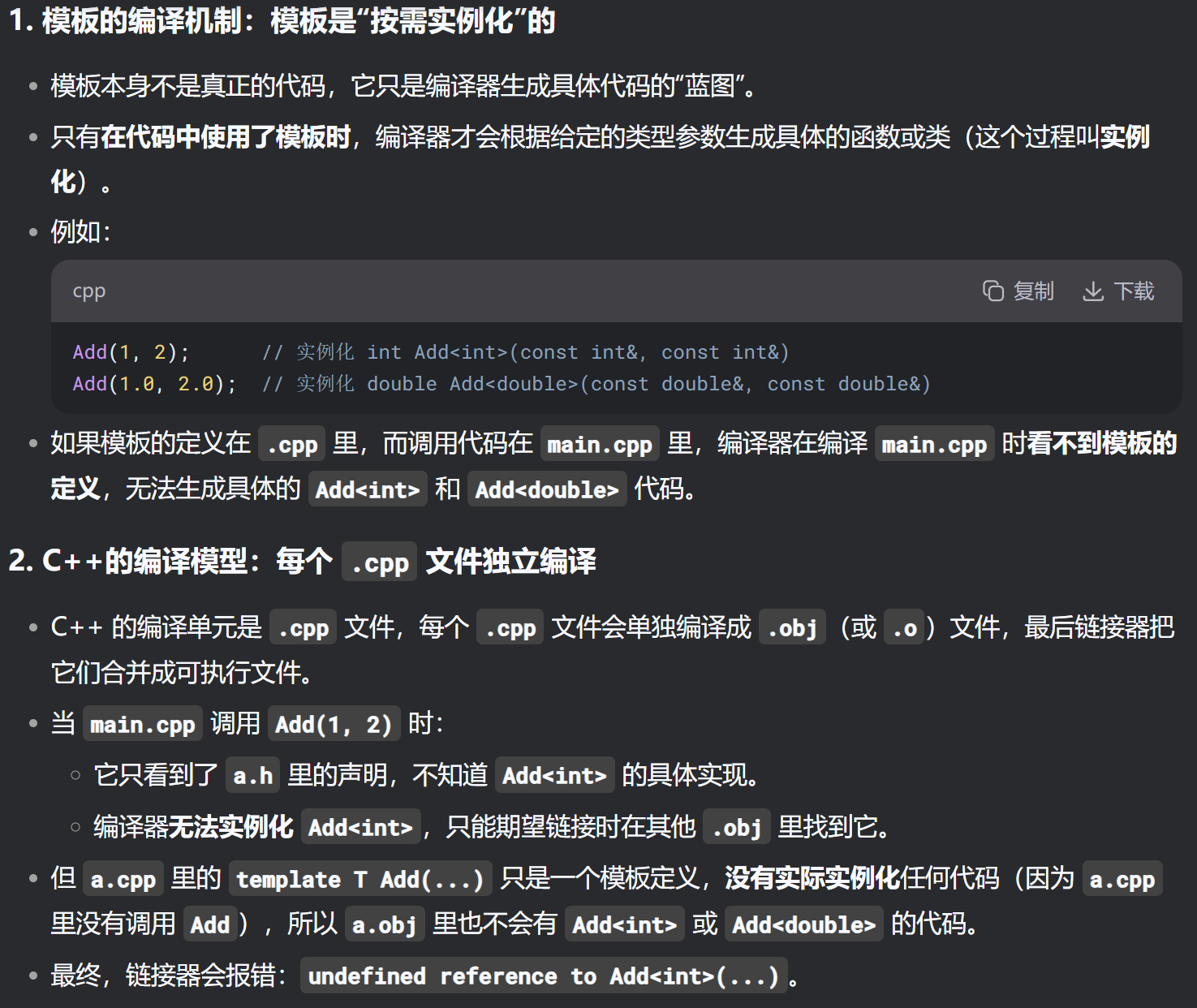 A.模板不支持分离编译,所以不能在.h声明,在.cpp实现
