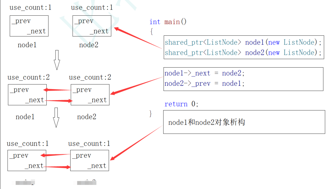 C:错误,有些场景下shared_ptr可能会造成循环引用,必须与weak_ptr配合使用