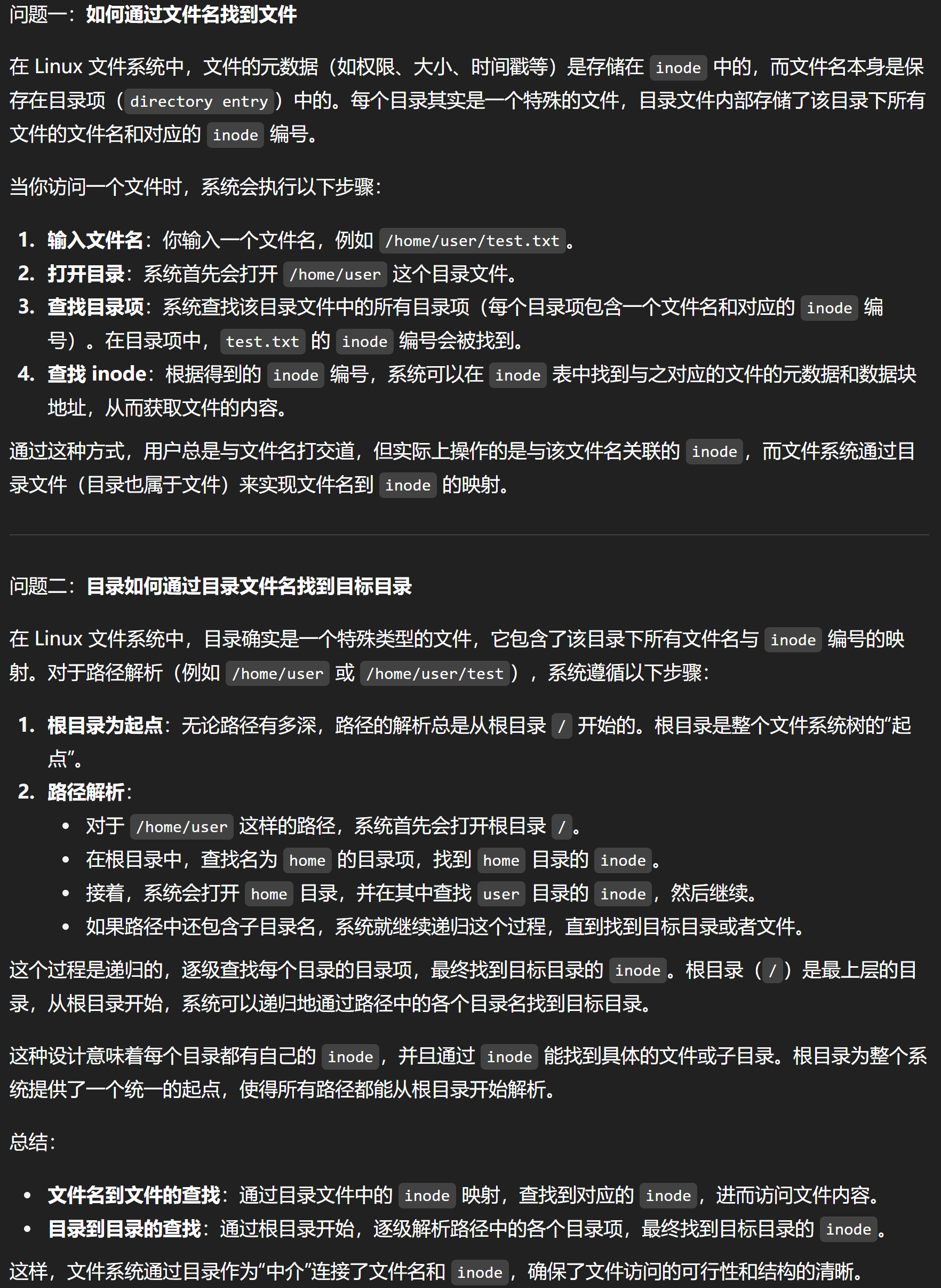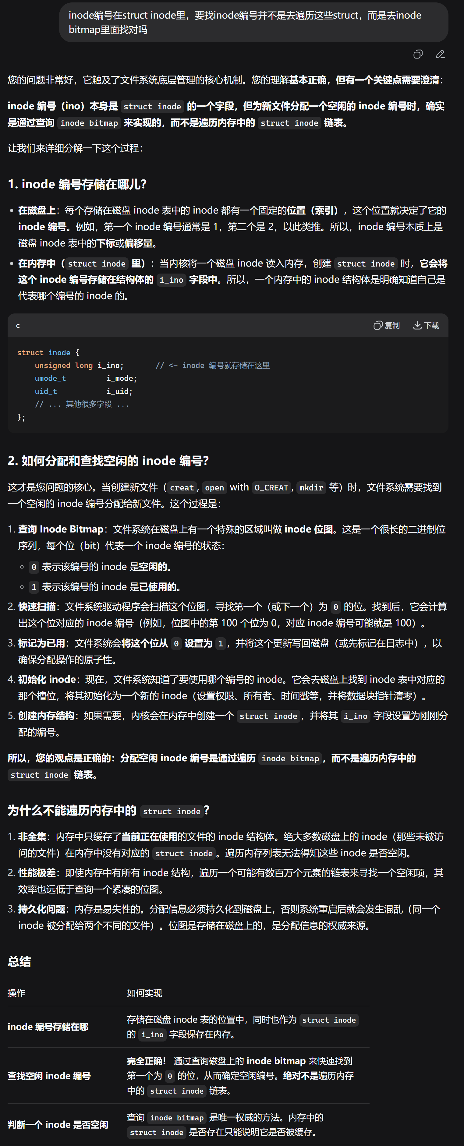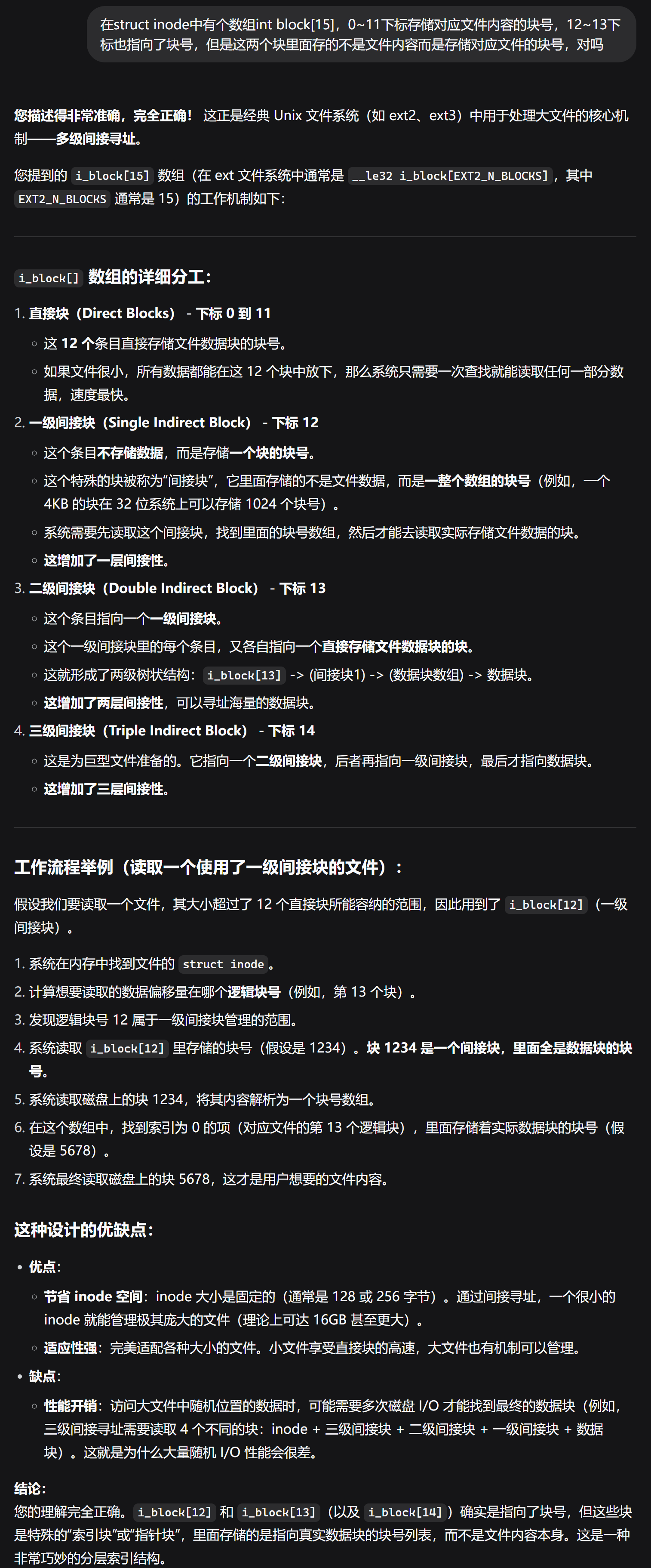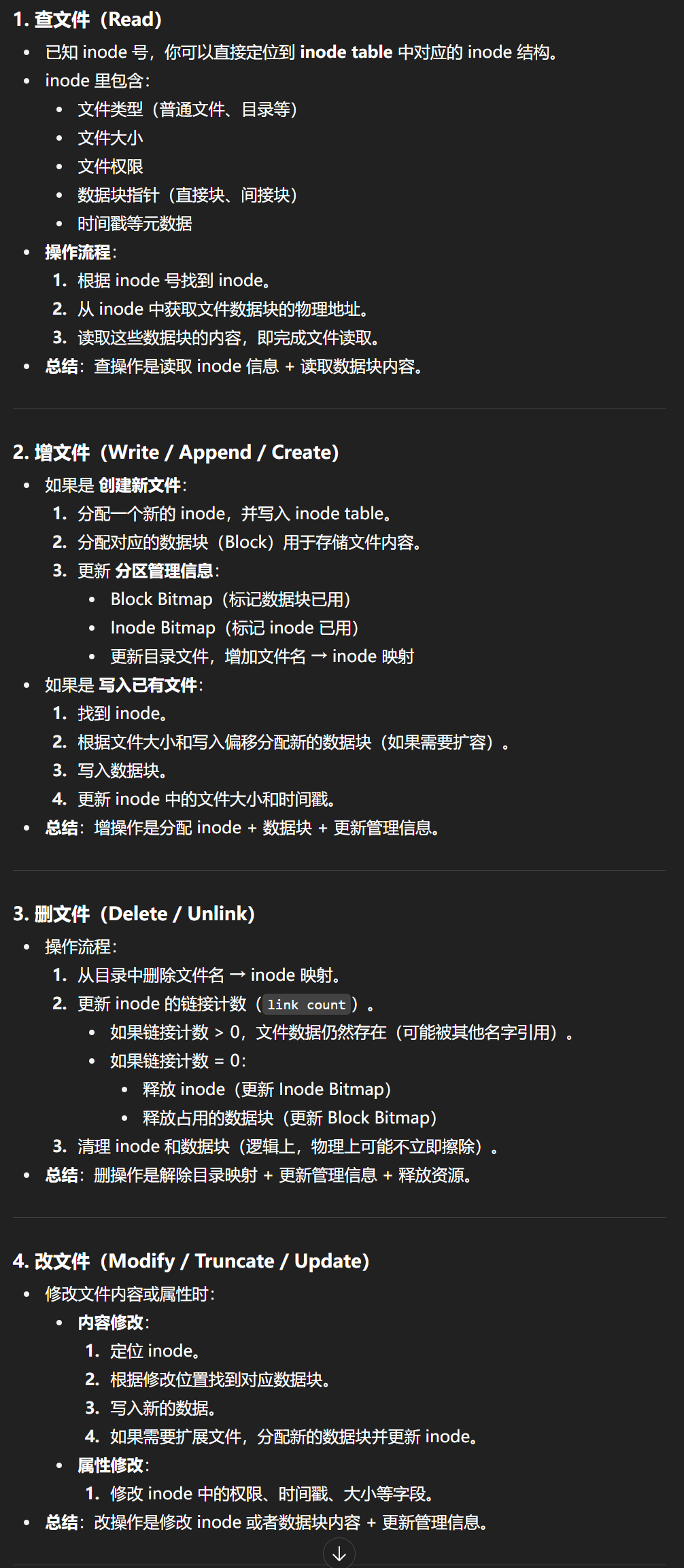 - D选项正确,inode就像是文件的一个整体的描述,有了这个描述,上层就可以重新组织虚拟逻辑结构,通过inode映射其物理结构(简单理解可以联想类似于虚拟地址空间与物理内存之间的页表)