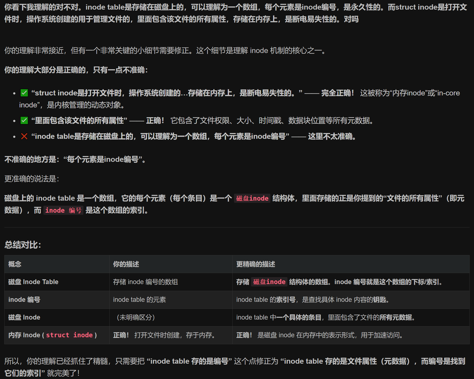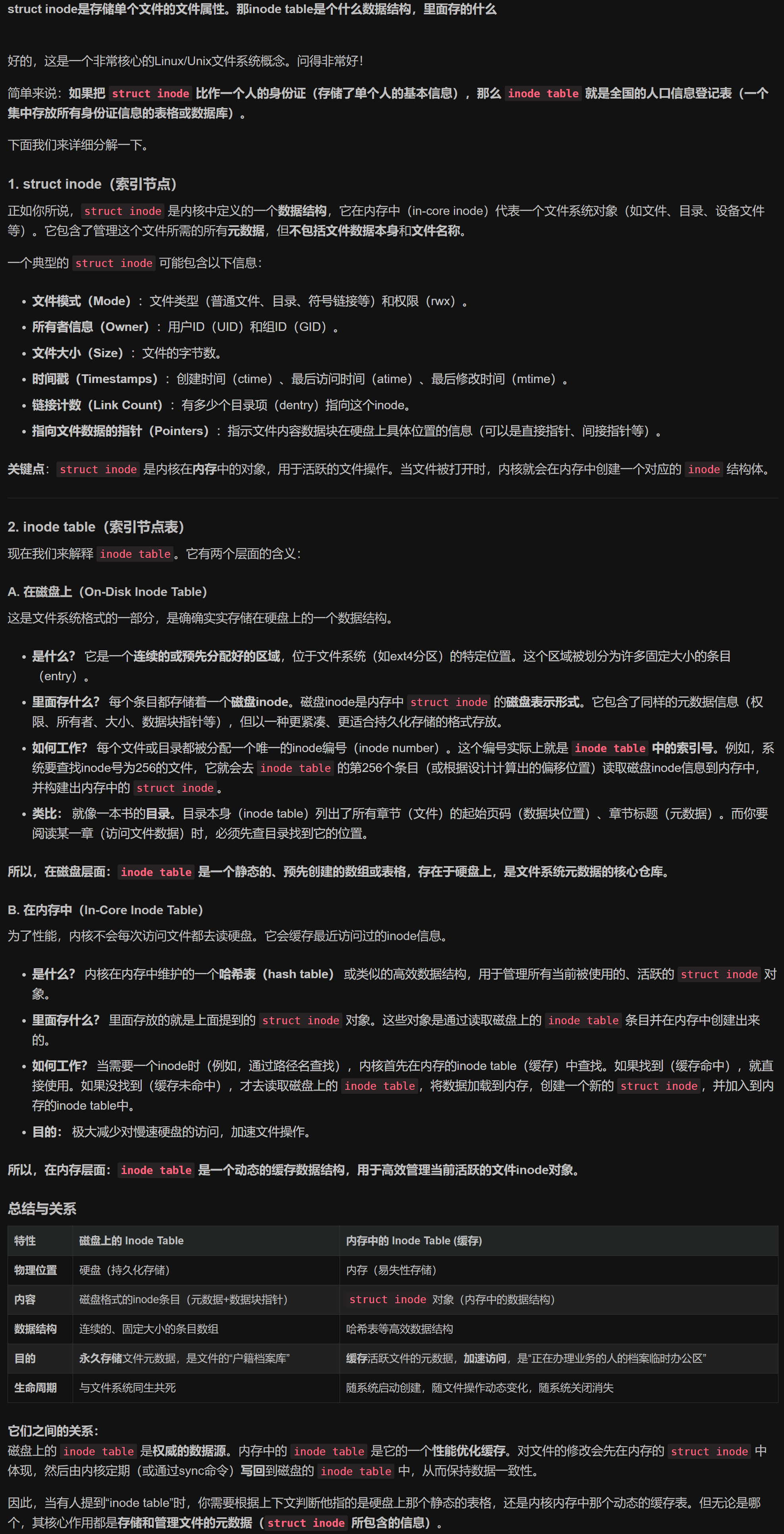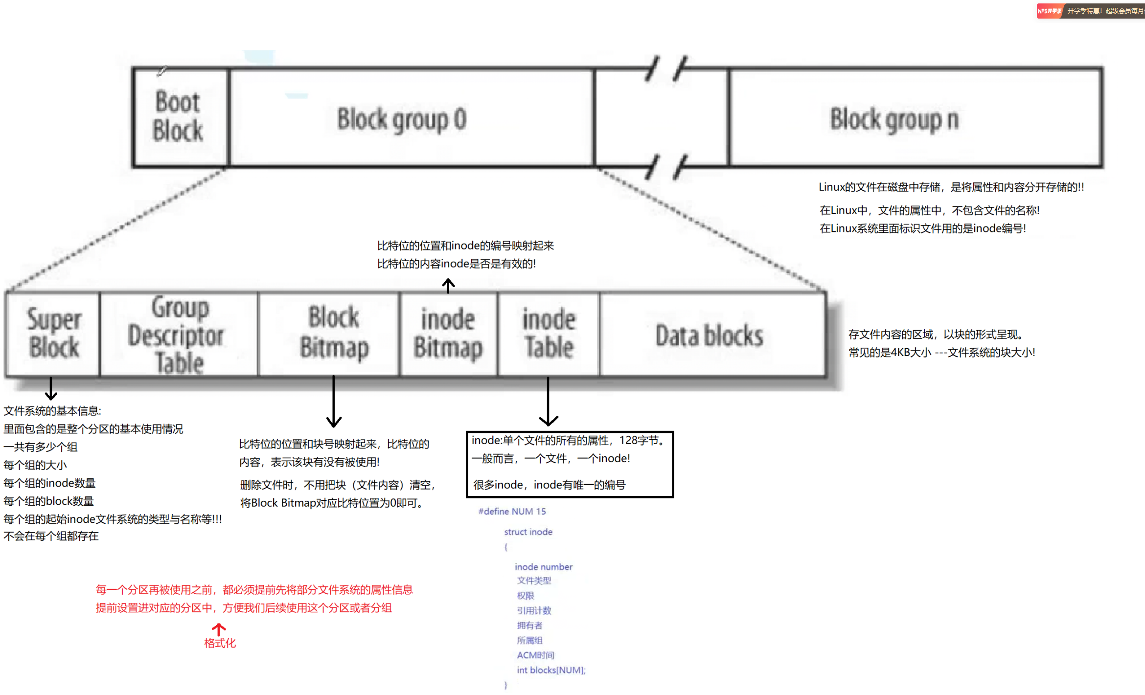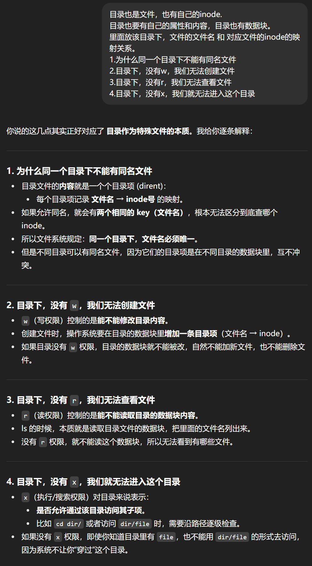 - D选项正确,inode就像是文件的一个整体的描述,有了这个描述,上层就可以重新组织虚拟逻辑结构,通过inode映射其物理结构(简单理解可以联想类似于虚拟地址空间与物理内存之间的页表)