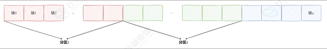 柱面是分区的最小单位,我们可以利用参考柱面号码的方式来进行分区,其本质就是设置每个区的起始柱面和结束柱面号码。此时我们可以将硬盘上的柱面(分区)进行平铺,将其想象成一个大的平面,如下图所示:
