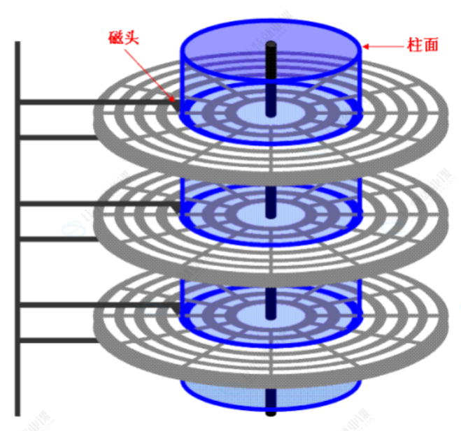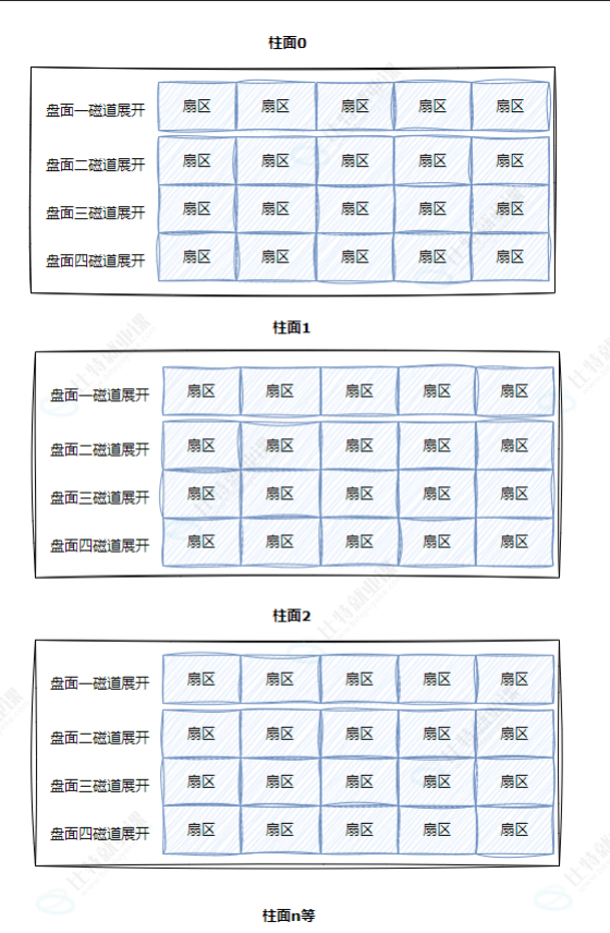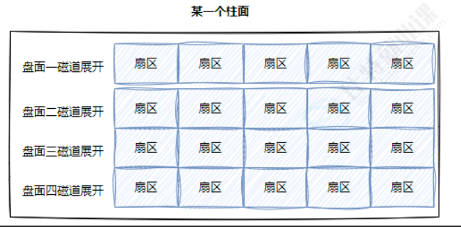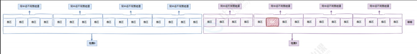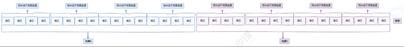 柱面是⼀个逻辑上的概念,其实就是每一面上,相同半径的磁道逻辑上构成柱面。