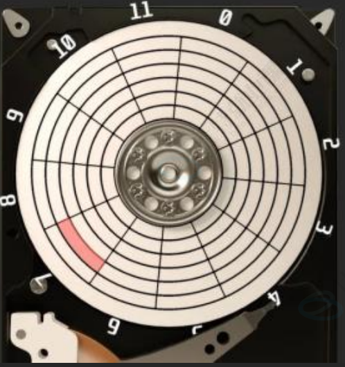 - 磁道(track)数:磁道是从盘片外圈往内圈编号0磁道,1磁道...,靠近主轴的同心圆用于停靠磁头,不存储数据