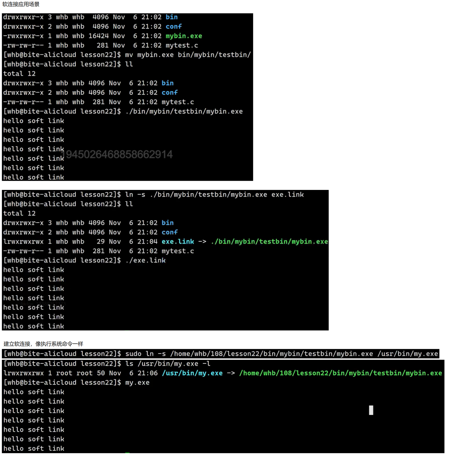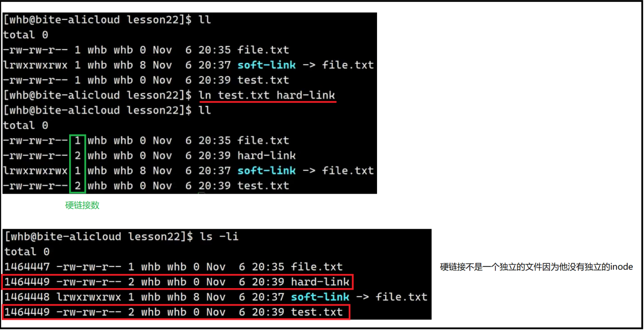 硬链接是通过 inode 引用另外一个文件,软链接是通过名字引用另外一个文件,但实际上,新的文件和被引用的文件的 inode 不同。应用上常见可以想象成一个快捷方式。在 shell 中的做法: