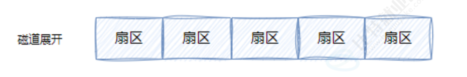 那么磁盘本质上虽然是硬质的,但是逻辑上我们可以把磁盘想象成为卷在一起的磁带,那么磁盘的逻辑存储结构我们也可以类似于: